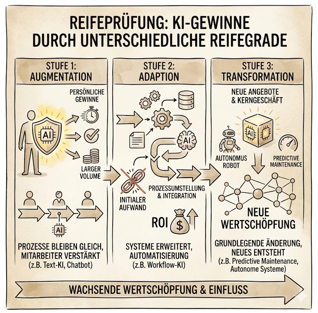 Um herauszufinden, wo die großen Gewinne durch KI erzielt werden können, lohnt es sich, auf die unterschiedlichen Reifegrade zu schauen. Hierfür nutzen wir ein einfaches Modell mit drei Stufen: